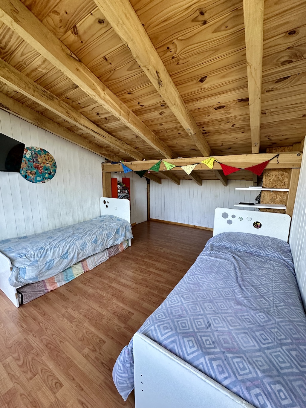 Casa distribuida en dos plantas. En planta baja consta de un living con chimenea hogar, comedor, cocina, lavadero, baño completo con bañera, toilet y hall frio. En planta alta consta de dos dormitorios.