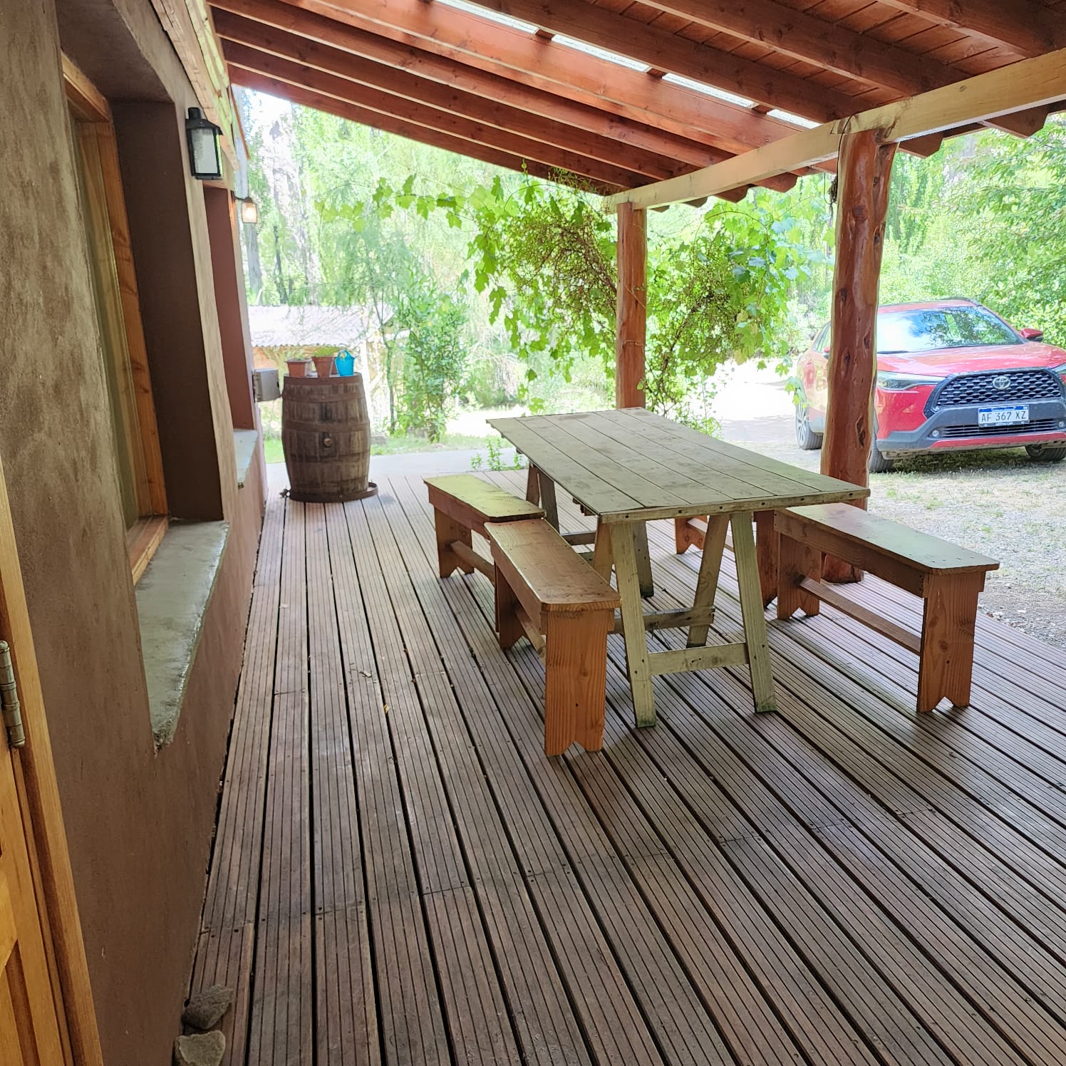Piso de material, paredes 50cm de altura de material, el resto de madera. Semi-cubierto exterior (leñera) 35m2 piso de tierra.